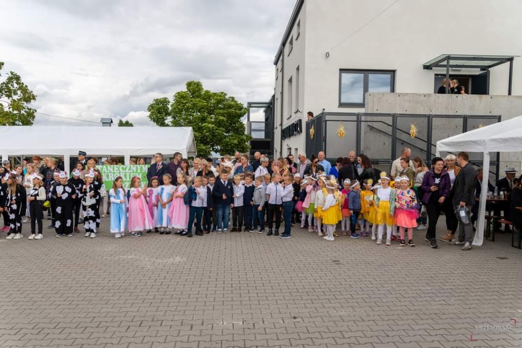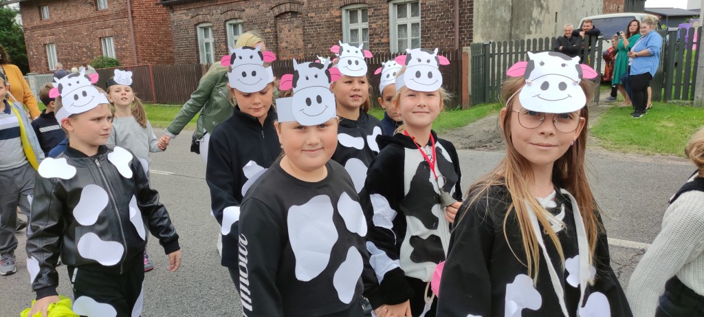 11 września braliśmy udział w gminnych obchodach święta plonów, które odbyły się w naszej miejscowości. Dożynkowe uroczystości zaczęły się barwnym korowodem, który przeszedł główną ulicą. Nasi uczniowie maszerowali przebrani za gospodarcze zwierzęta. I tak można było między innymi zobaczyć śliczne czarno-białe krówki, urocze świnki i różowe króliczki. Niektórzy mieszkańcy wzdłuż trasy przygotowali barwne i niepozbawione humoru mostki. Po przybyciu na boisko i części oficjalnej dzieci przedszkolne i uczniowie zaprezentowali swoje występy artystyczne: