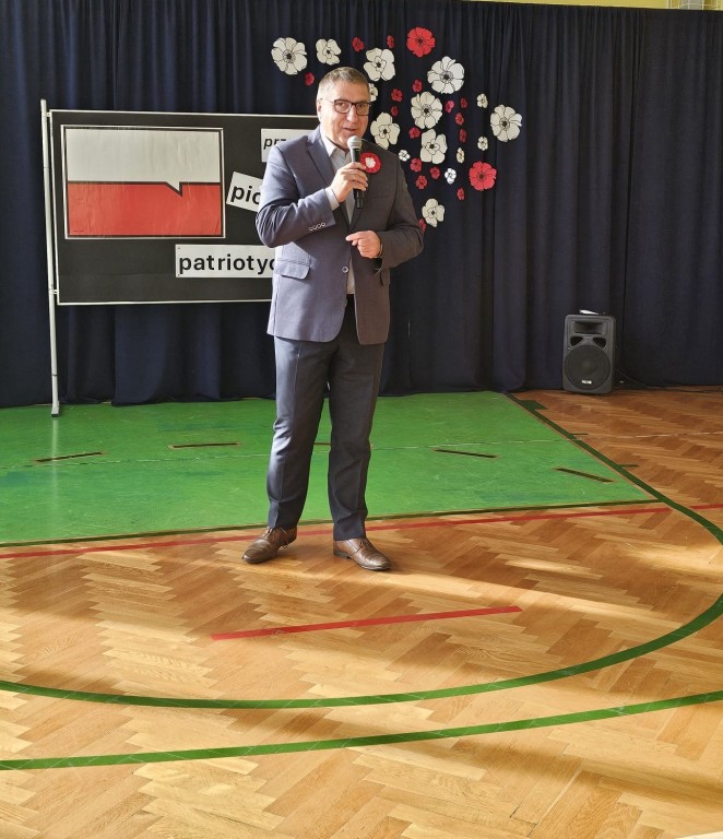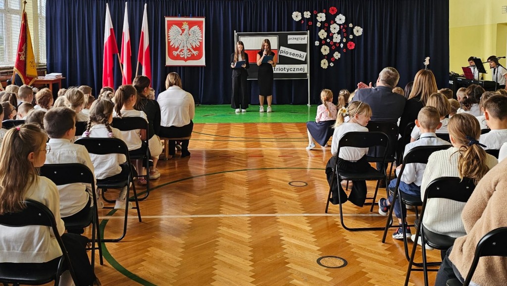 „O mój rozmarynie” czy „Żeby Polska była Polską”. Szczególne emocje wzbudziły występy najmłodszych uczestników – uczniów zerówki oraz klas pierwszych. Ich zaangażowanie i dziecięca radość śpiewania poruszyły całą publiczność. Niezwykłym momentem był również występ klasy szóstej, która wykonała „Rotę” – podczas tego utworu wszyscy zgromadzeni wstali z szacunkiem. Na zakończenie głos zabrał dyrektor szkoły, pan Artur Mielczarek, który przypomniał o przedwojennych korzeniach szkolnego sztandaru. Pan dyrektor wręczył także nagrody laureatom szkolnego etapu XIII Ogólnopolskiego Dyktanda Niepodległościowego „Po polsku o historii”. Wspólne śpiewanie patriotycznych pieśni stało się piękną lekcją historii i miłości do Ojczyzny, a jednocześnie sposobem na uczczenie kolejnej rocznicy odzyskania przez Polskę niepodległości.