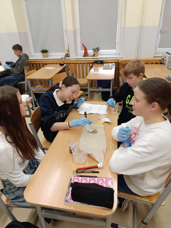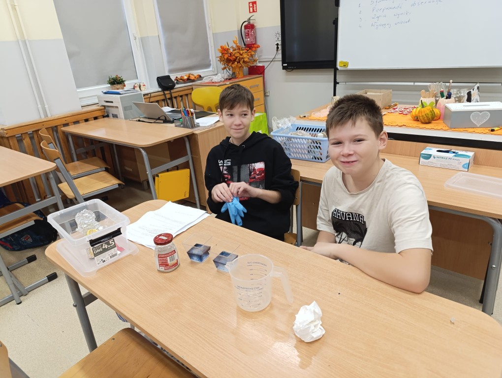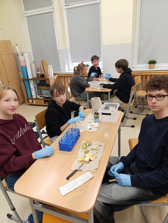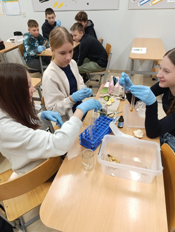Wykrywanie składników pokarmowych w produktach spożywczych – zajęcia klas 7. Uczniowie klasy 7a i 7b uczestniczyli w zajęciach biologii poświęconych wykrywaniu podstawowych składników pokarmowych w wybranych produktach żywnościowych. Podczas lekcji przeprowadzali doświadczenia pozwalające zidentyfikować obecność skrobi, cukrów prostych, białek, tłuszczów oraz obecność witaminy C. Praca z odczynnikami chemicznymi, obserwacja zmian zachodzących w próbkach oraz formułowanie wniosków umożliwiły uczniom praktyczne utrwalenie wiedzy z zakresu biochemii. Zajęcia stanowiły także okazję do rozwijania umiejętności laboratoryjnych oraz nauki pracy metodą badawczą. Dlaczego to ważne? Składniki pokarmowe pełnią kluczową rolę w prawidłowym funkcjonowaniu organizmu: