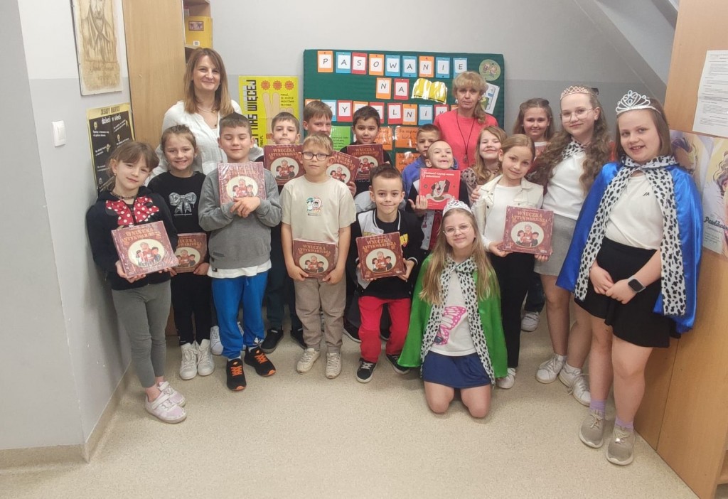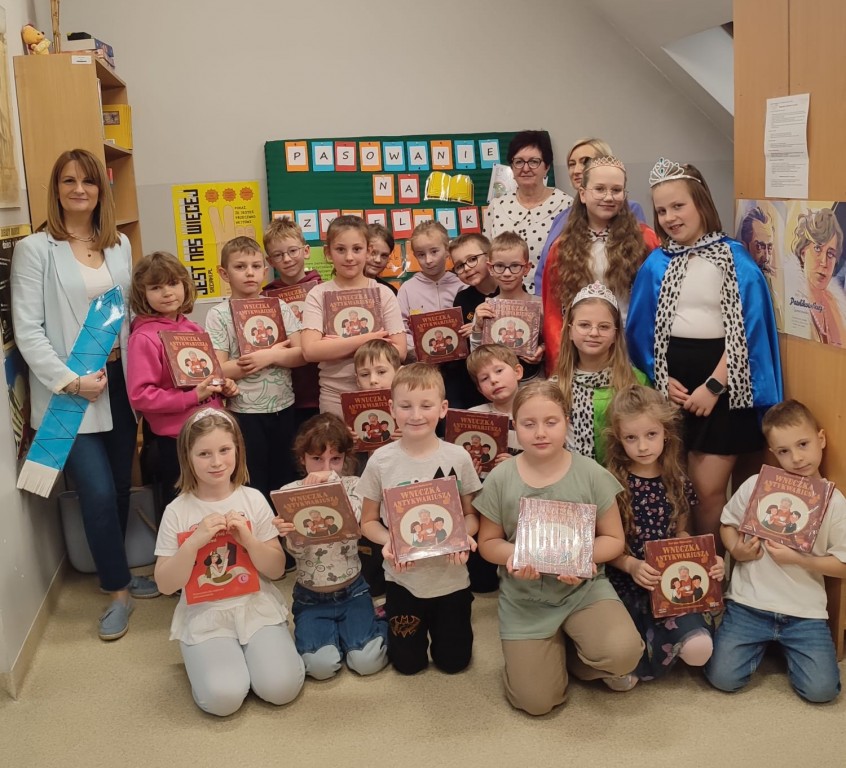 Ważnym elementem uroczystości było spotkanie ze starszymi koleżankami z klasy czwartej, które w przystępny sposób zapoznały młodszych uczniów z zasadami obowiązującymi w bibliotece. Przypomniały, jak należy dbać o książki i jak właściwie się z nimi obchodzić, aby mogły służyć kolejnym czytelnikom. Kulminacyjnym momentem wydarzenia było uroczyste ślubowanie, po którym pani wicedyrektor dokonała pasowania uczniów na czytelników. Na pamiątkę tego wyjątkowego dnia dzieci otrzymały książki z wyprawki „Mała książka – wielki człowiek” – „Wnuczkę antykwariusza” autorstwa Justyny Bednarek – oraz zakładki do książek. Mamy nadzieję, że nowi czytelnicy z radością i ciekawością będą odwiedzać szkolną bibliotekę, rozwijając swoje zainteresowania czytelnicze i odkrywając niezwykły świat książek.